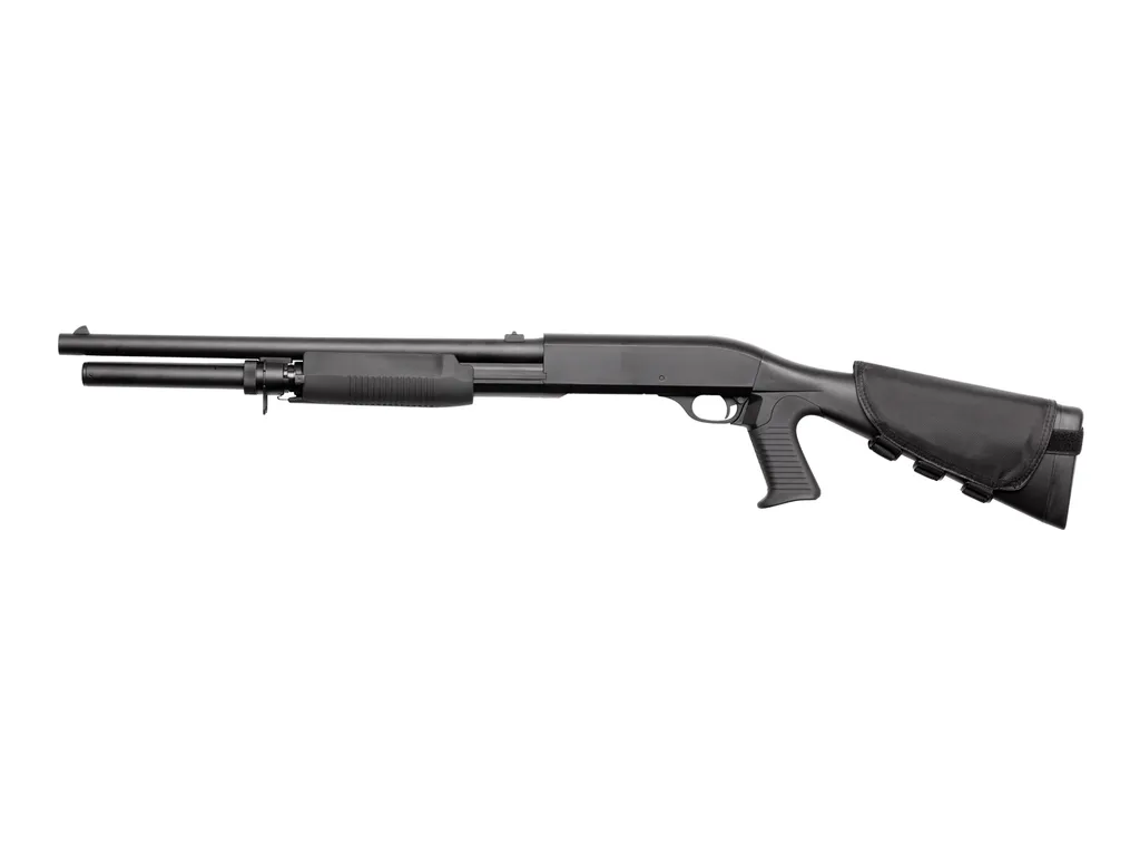 This Sportline model, the Franchi SAS 12 3-burst, together with its little brother (Ref. 16261) is as real as it gets in Airsoft. The shotgun uses the realistic 30 BB shells and fires 3 rounds with each shot, adding to the realism of a ‘realsteel’ shotgun. The shells can be stored on the stock in the supplied cartridge stock-holster. Furthermore it weights over 2 kilo and with more than 1 meter in length and metal barrel this will impress most people.