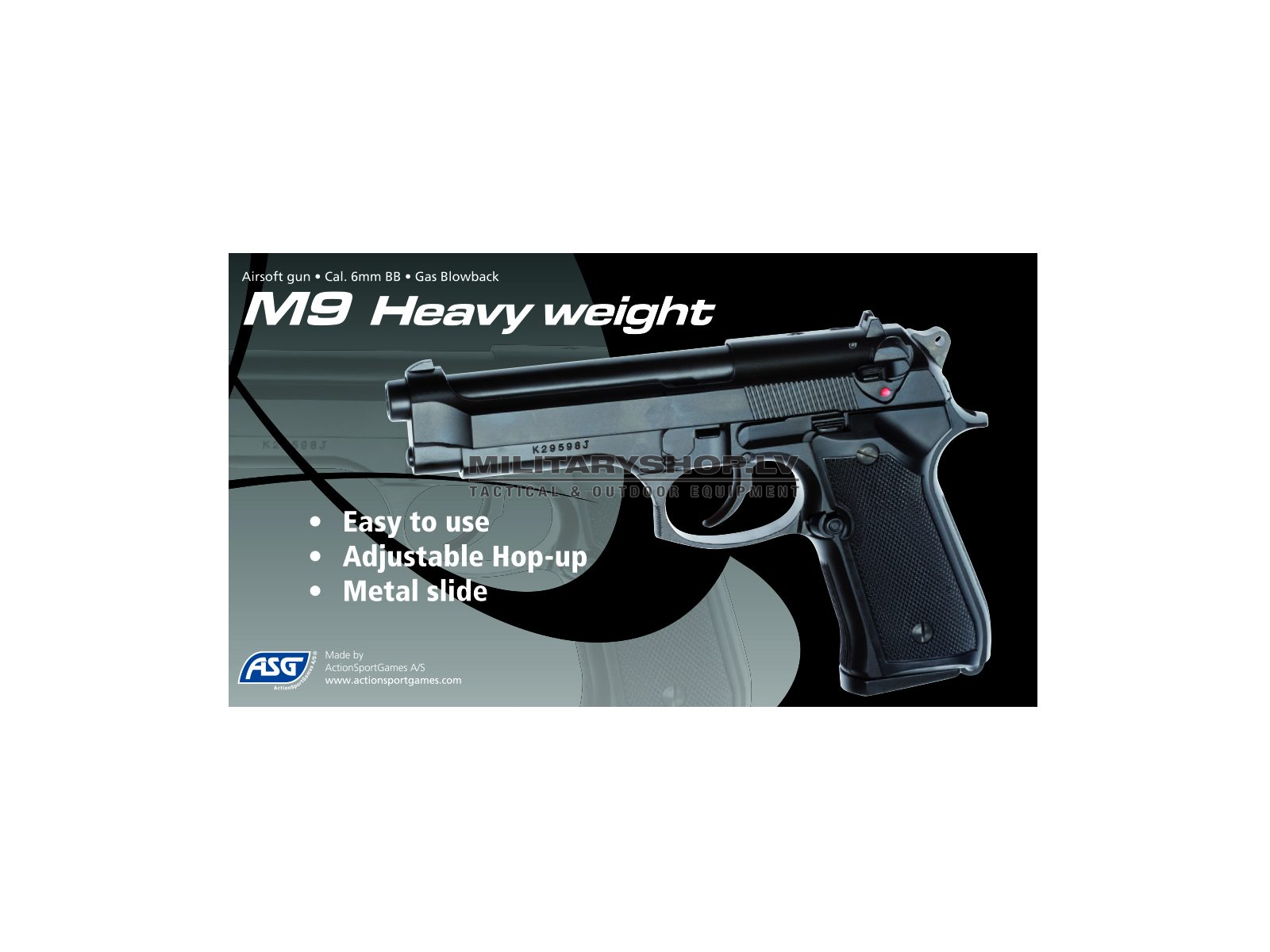 A version of the classic M9 models with metal slide – a very realistic feeling and handling. Gas operated semi-automatic blowback with adjustable Hop-up and a double stacked magazine that holds 25 BB’s .