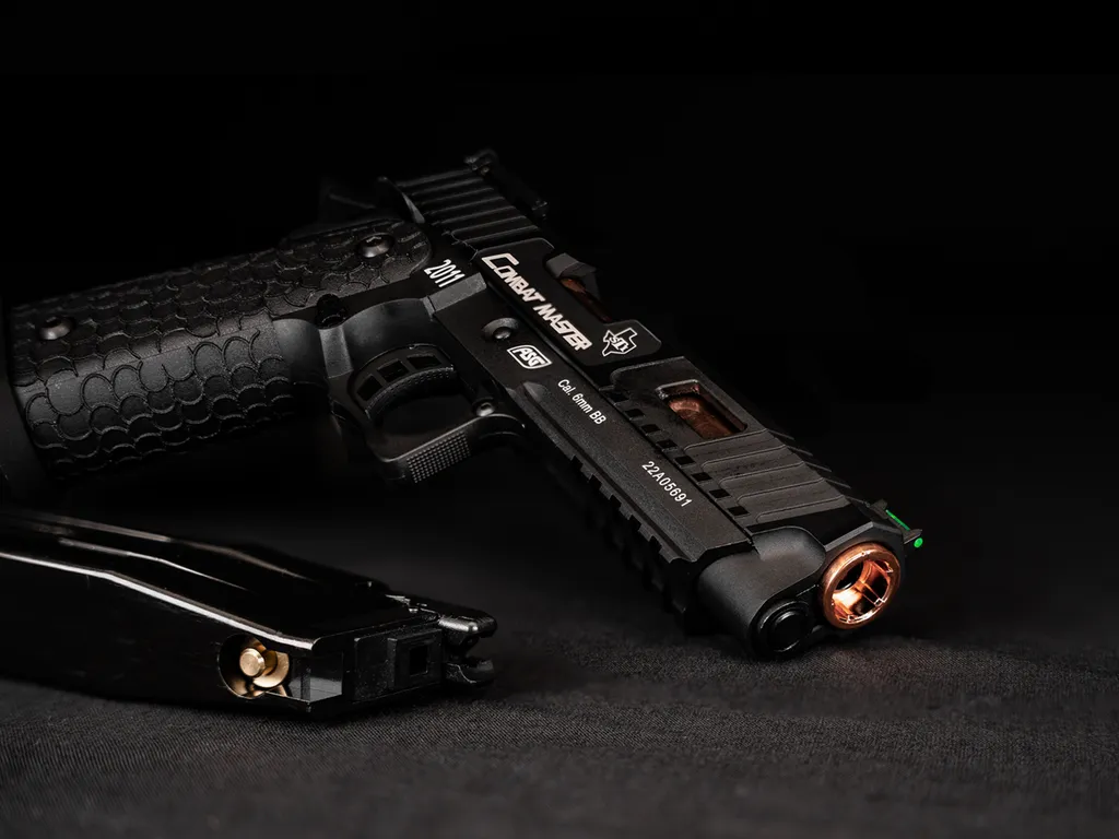 Designed with new refinements and modifications to the ‘2011’ platform to improve the ‘Combat Master’ for competition shooters. This revolutionary re-design sports a wide range of enhancements to give you the edge at the range or in an airsoft skirmish. The rugged metal slide has been cut and refined to lighten the pistol while carefully placed serrations and its stippled grip enable perfect hold and grip – even in the most testing conditions. The flared magwell and enlarged magazine release allow for flawless reloads while a perfectly tuned trigger ensures a crisp break and light response. Lastly, professional competition ‘target’ sights with a fibre optic foresight assist in rapid target acquisition!