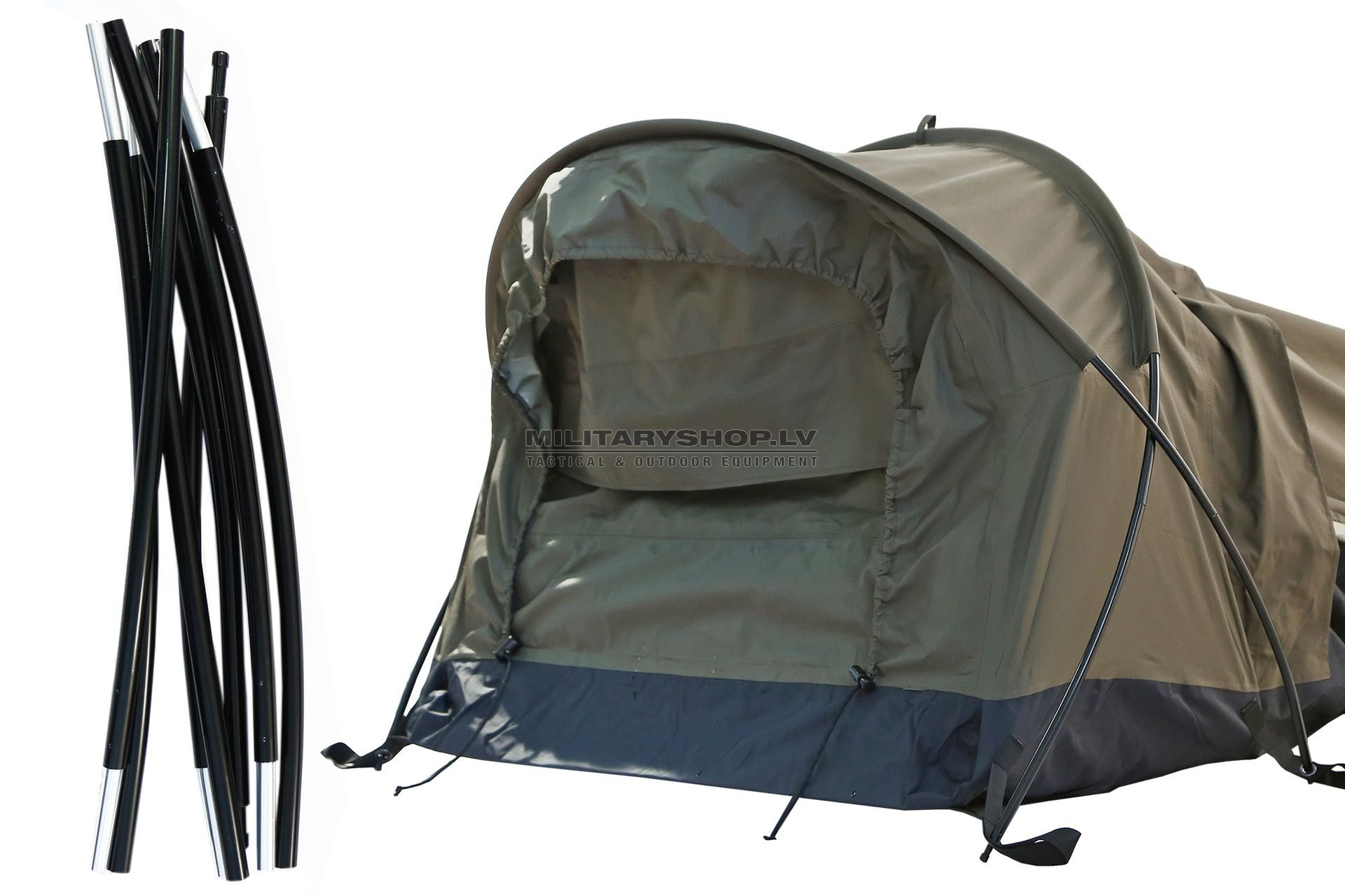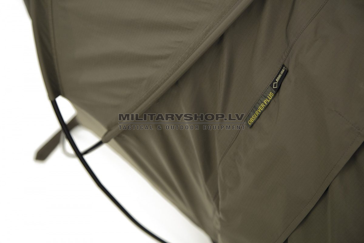 Observer Plus: The perfect bivy bag with self-standing double pole support. 2 tent poles form a small dome at the head end which provides enough space for the user to handle a rifle or other piece of equipment. The bivy bag slopes down from the shoulder to the foot end thus preventing straight lines which are easily spotted.