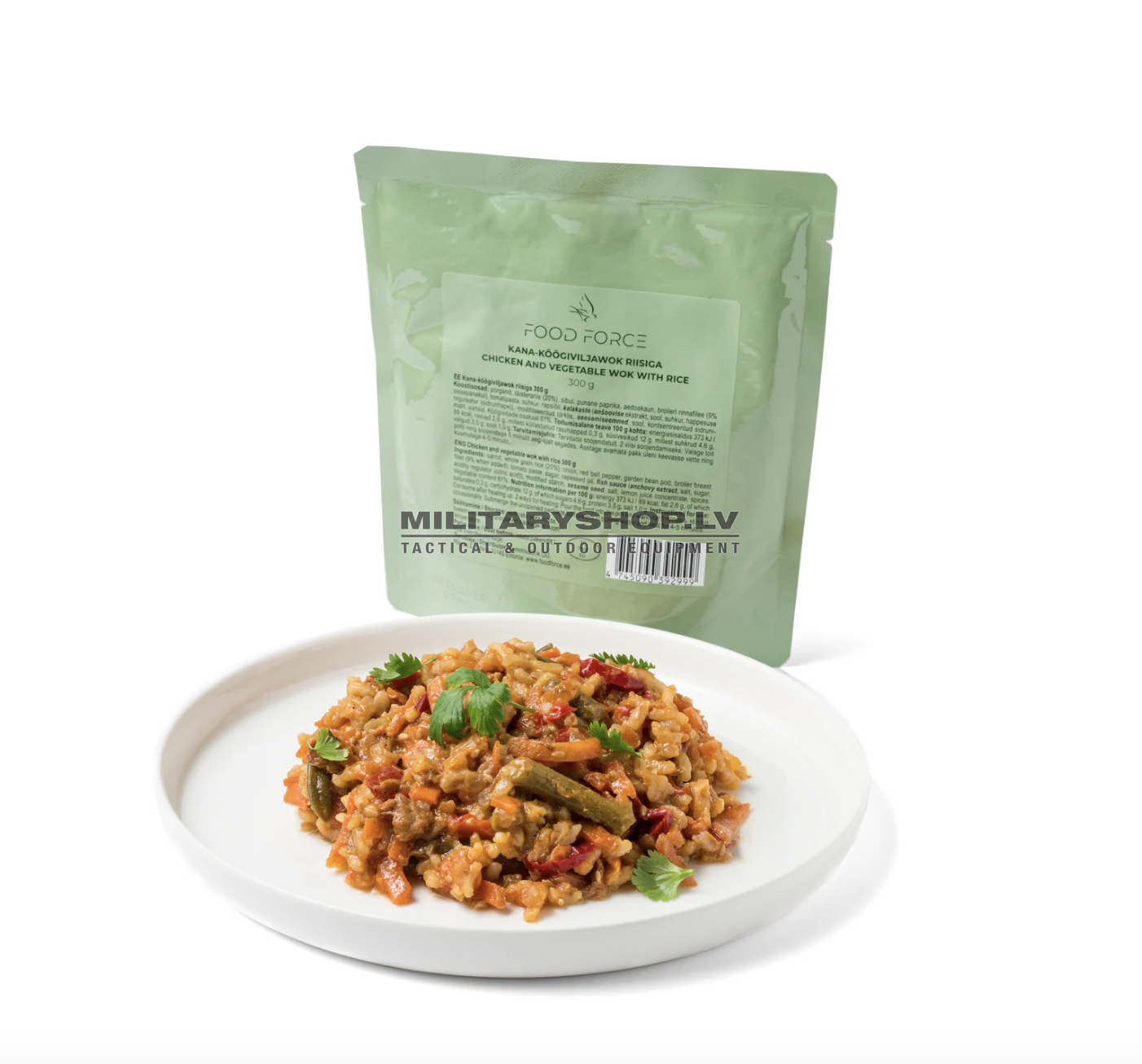 Ingredients: carrot, whole grain rice (20%), onion, red bell pepper, garden bean pod, broiler breast fillet (9% when added), tomato paste, sugar, rapeseed oil, FISH sauce (ANCHOVY extract, salt, sugar, acidity regulator (citric acid)), modified starch, SESAME seeds, salt, lemon juice concentrate, spices. Vegetable content is 61%.
