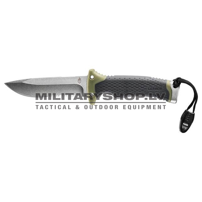 This knife is made of cold quality stainless steel. A notched blade will also help cut through difficult-to-cut materials such as ropes or cargo straps. The handle of the knife is covered with polypropylene, rubber elements are built into it for better grip. There is a whistle in the loop at the end of the knife. The tip of the knife handle can be used as an tool to crush nuts, small animal bones, etc. The knife is combined with a fuller and flint to light a fire.