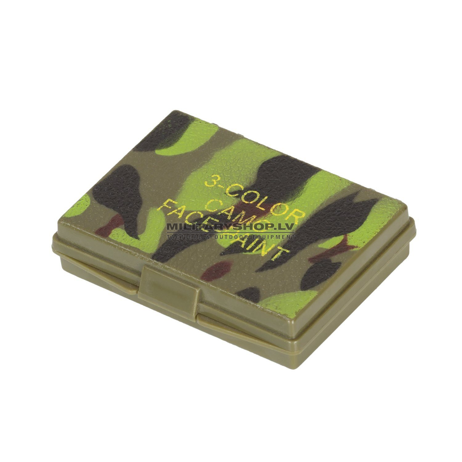 Paint for camouflaging of face and other uncovered body parts. Kit includes three colors of paint (black, olive and red), contained in a handy box wif a mirror.