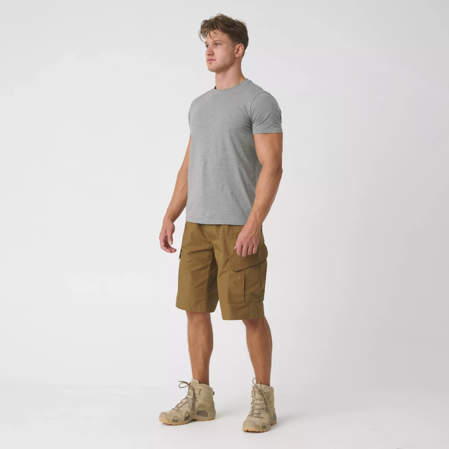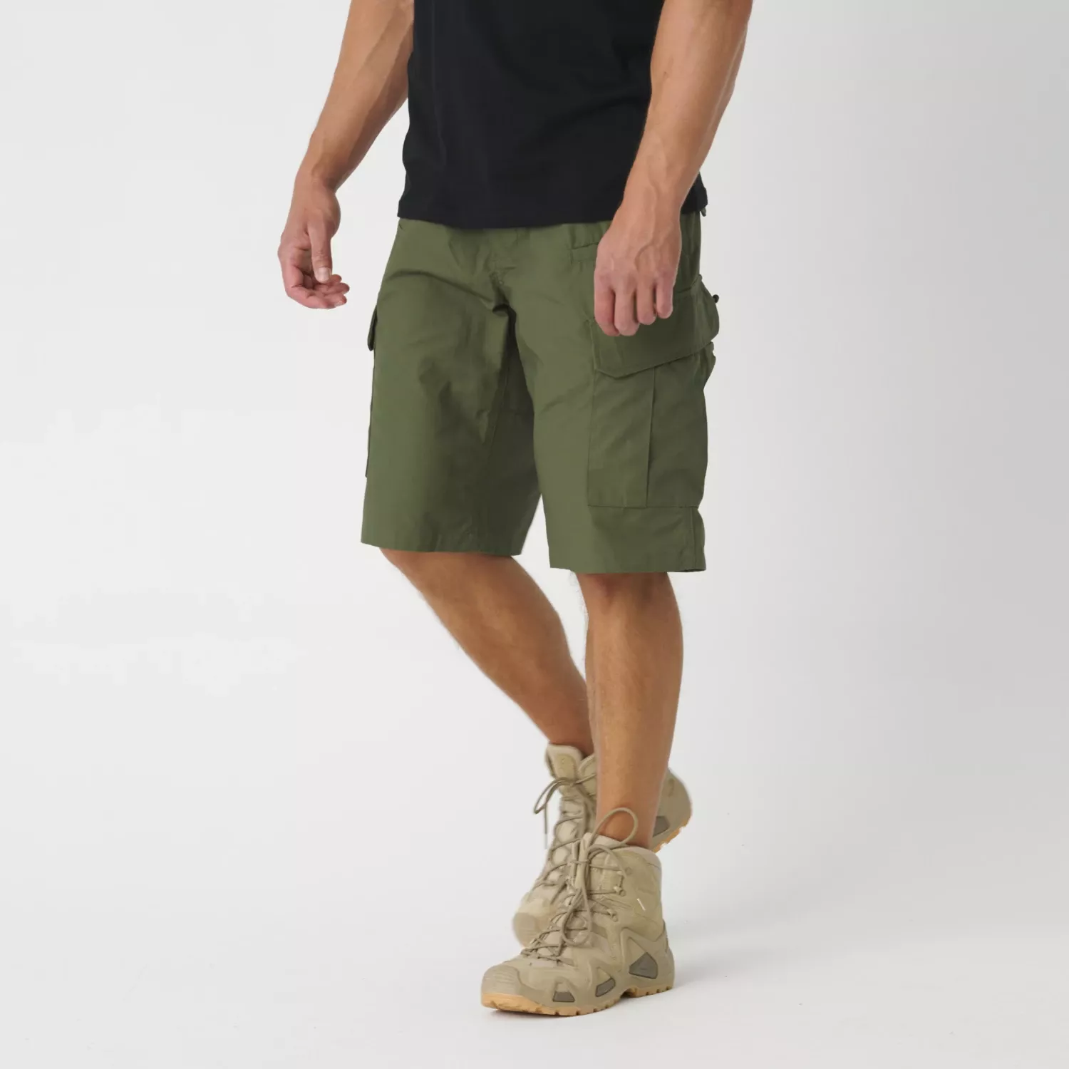 The eight practical pockets in these military shorts enable convenient carrying of everyday gear. Two classic hip pockets can accommodate a knife or flashlight. Two small front pockets are designed for small equipment items such as a smartphone. Two thigh pockets with hook & loop, buttons, and a drawstring can serve as dump pouches for empty magazines. Additional loops for carabiners are sewn under the front belt loops.
