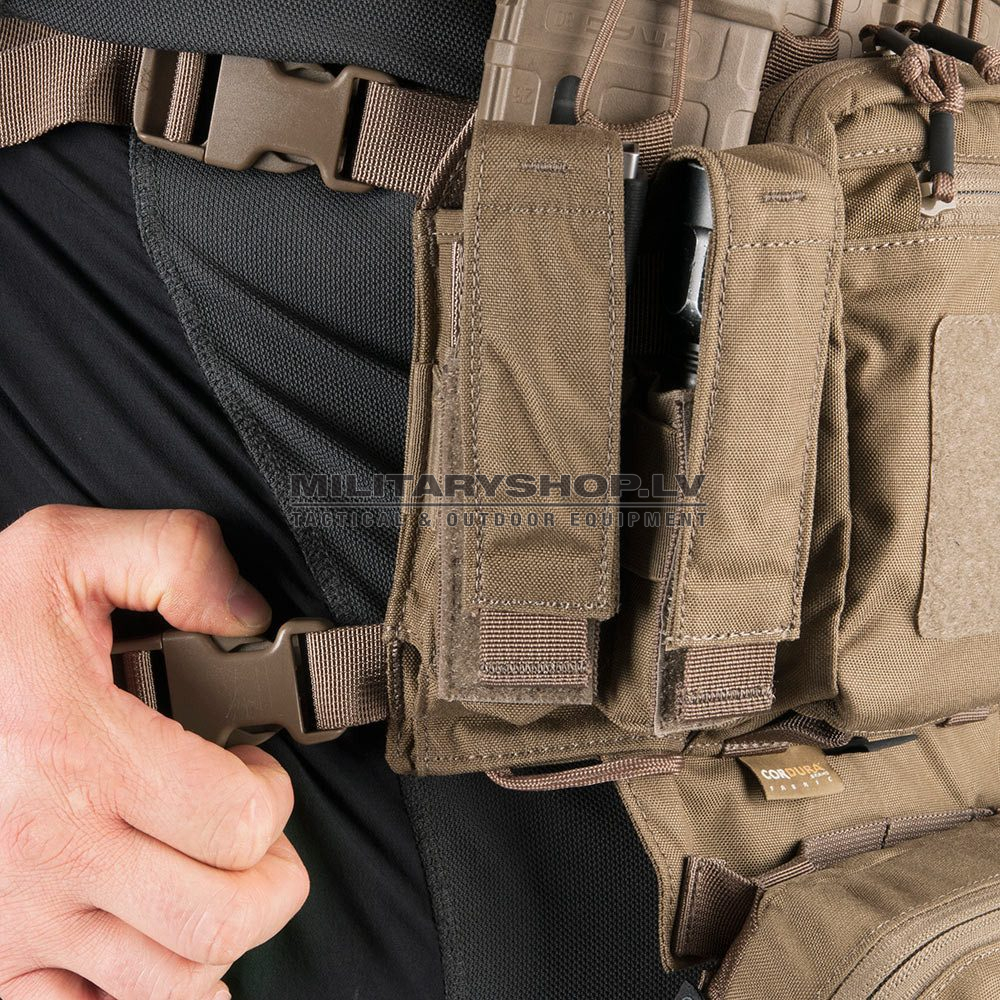 • Four fixed pockets with detachable flaps for pistol magazines, multitools and flashlights