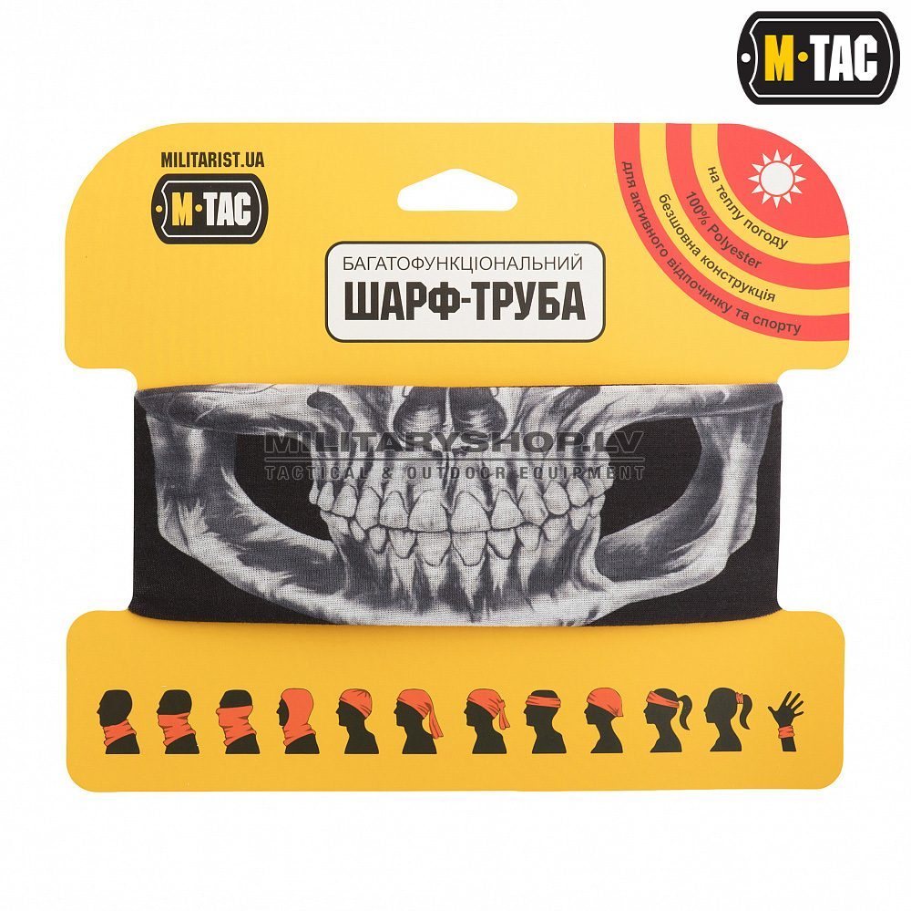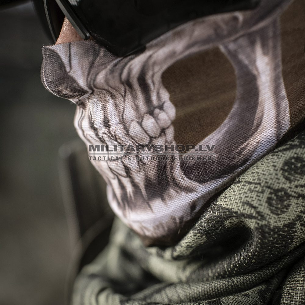 Multifunctional bandana Reaper Skull, also known as Multi-Wrap and also known as Recon Wrap, is another multifunctional accessory from the M-Tac brand. The product has a shape of a tube and is made of thin knitted fabric (100% polyester), which you can easily turn into an under helmet cap, balaclava, Sahara bandana, one-layer, and two-layer hat, dust mask, scarf, and headband. It is easy to stretch. Also, it dries quickly. When folded, it takes up almost no space. This product is equally useful for airsoft, hiking, cycling, and motorsports. Used by the military around the world.