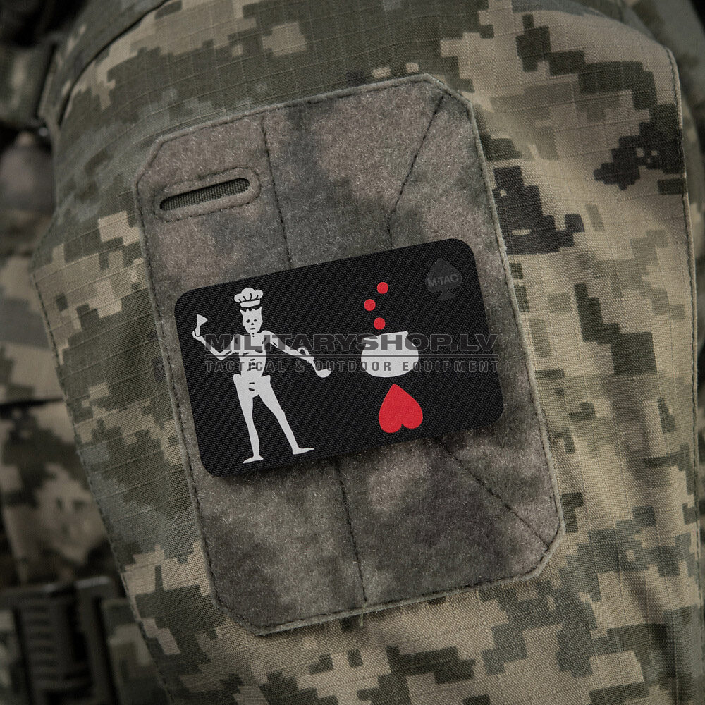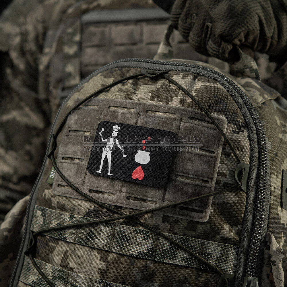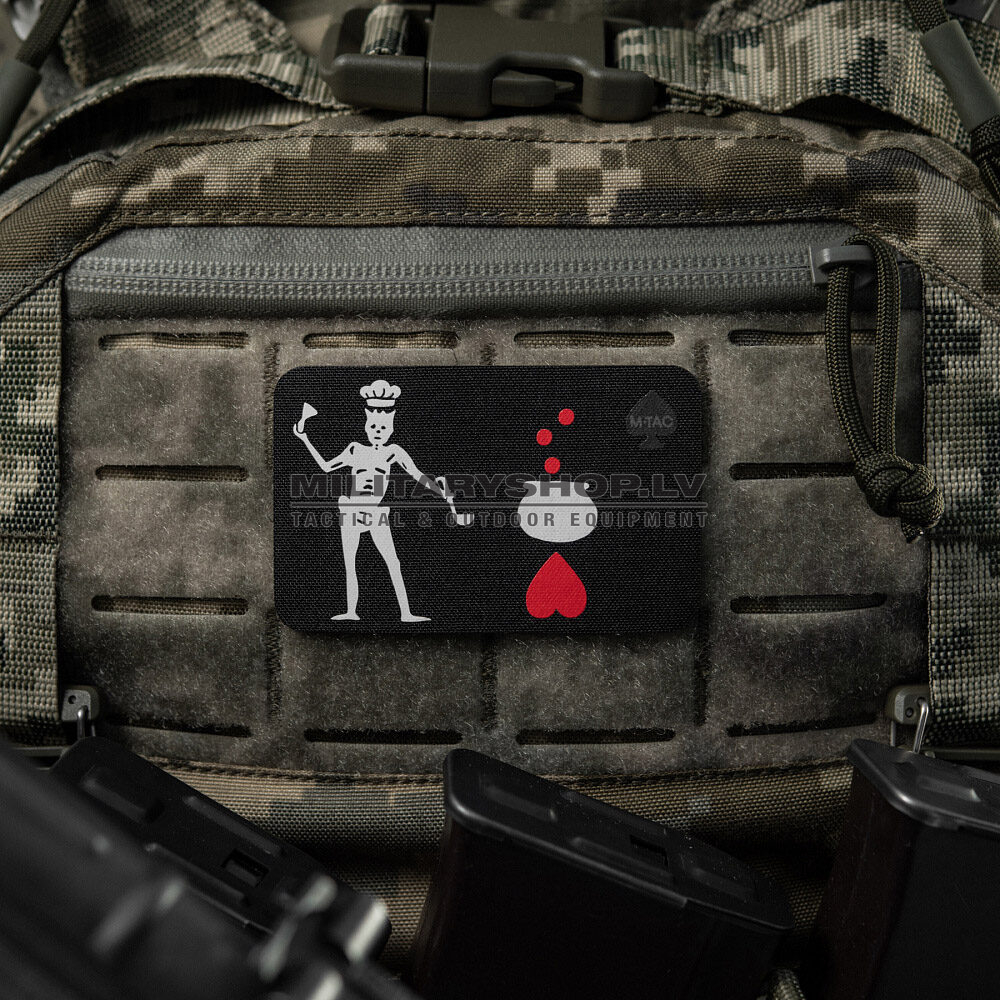 M-Tac has created a series of BLACK BEARD FLAG themed patches, which are a modernized version of his legendary flag. The patches depict a demon who has replaced his usual spear with a variety of modern weapons. With the aid of these weapons, he will eliminate opponents even more efficiently and accurately. In his right hand, the demon holds an hourglass, which serves as a reminder to his enemies that their time is almost up and they will soon face inevitable defeat and death.