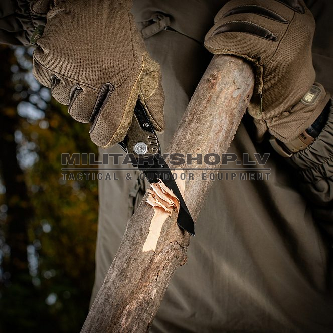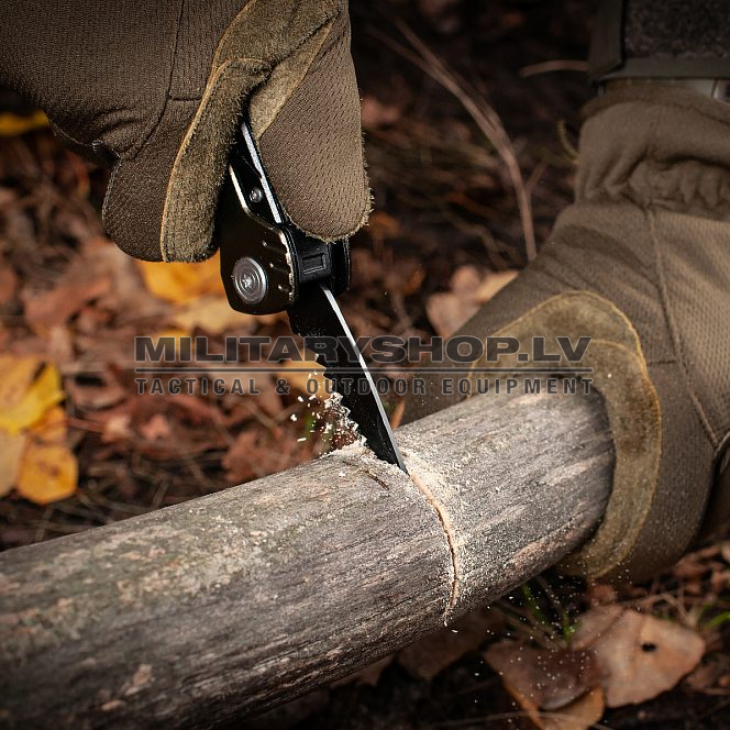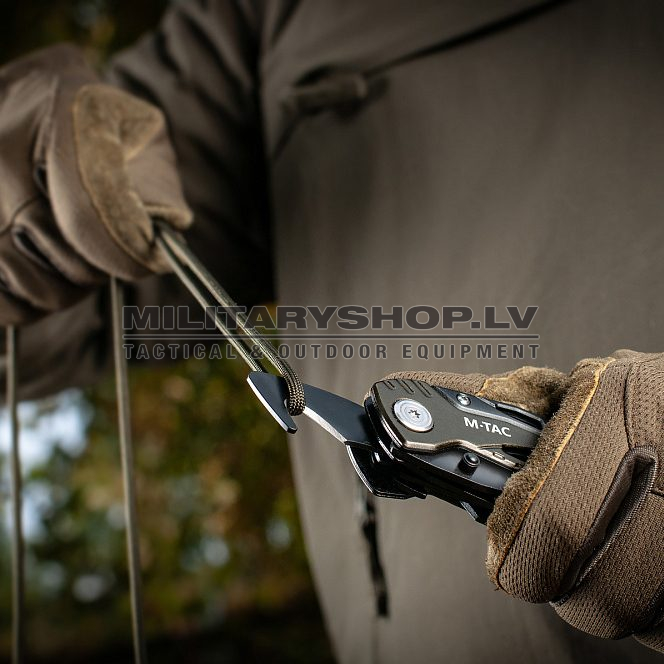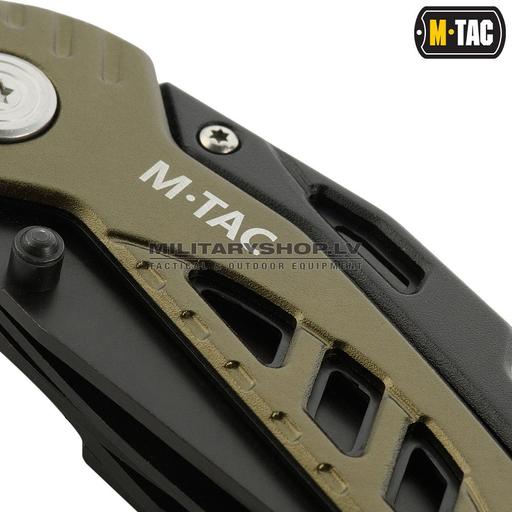 A modern compact universal tool from the M-Tac brand. The set includes 7 items: combination pliers with wire cutters, a regular sharpened blade, a hand saw, a Philips-head screwdriver, a wire stripper, and an opener.