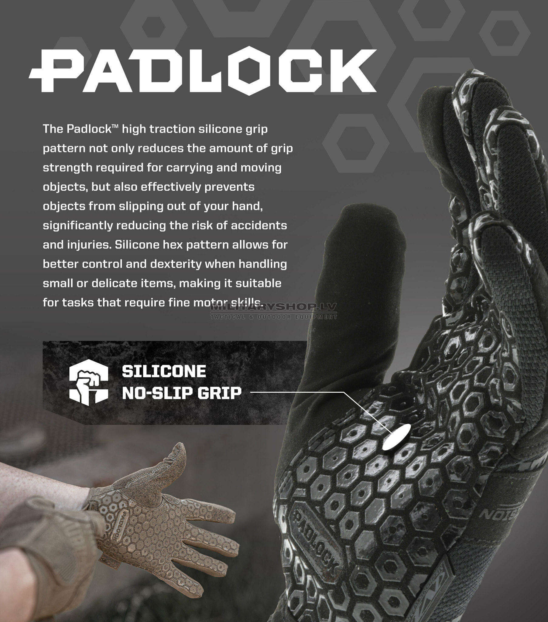 5. Padlock™ no-slip silicone grip palm pattern.