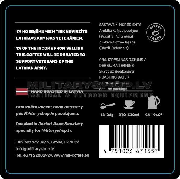Roasted exclusively for Militaryshop.lv by Rocket Bean Roastery.