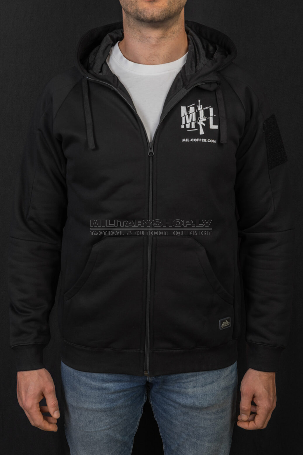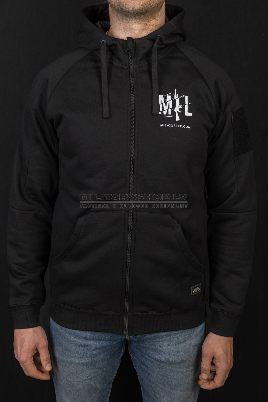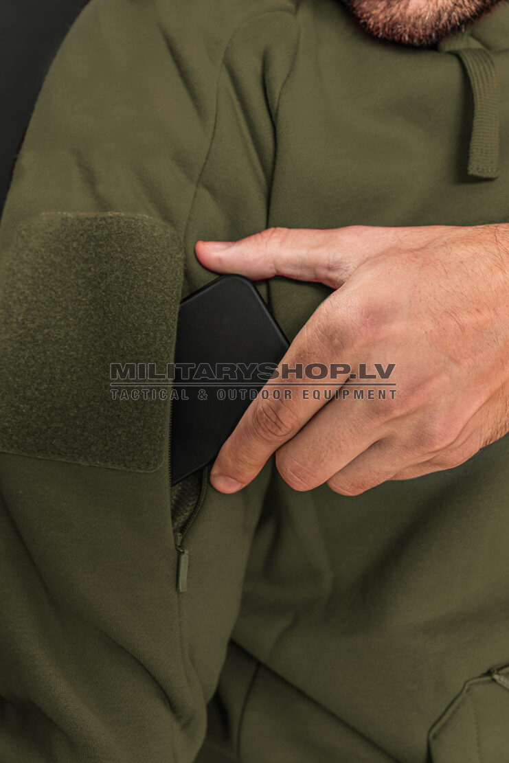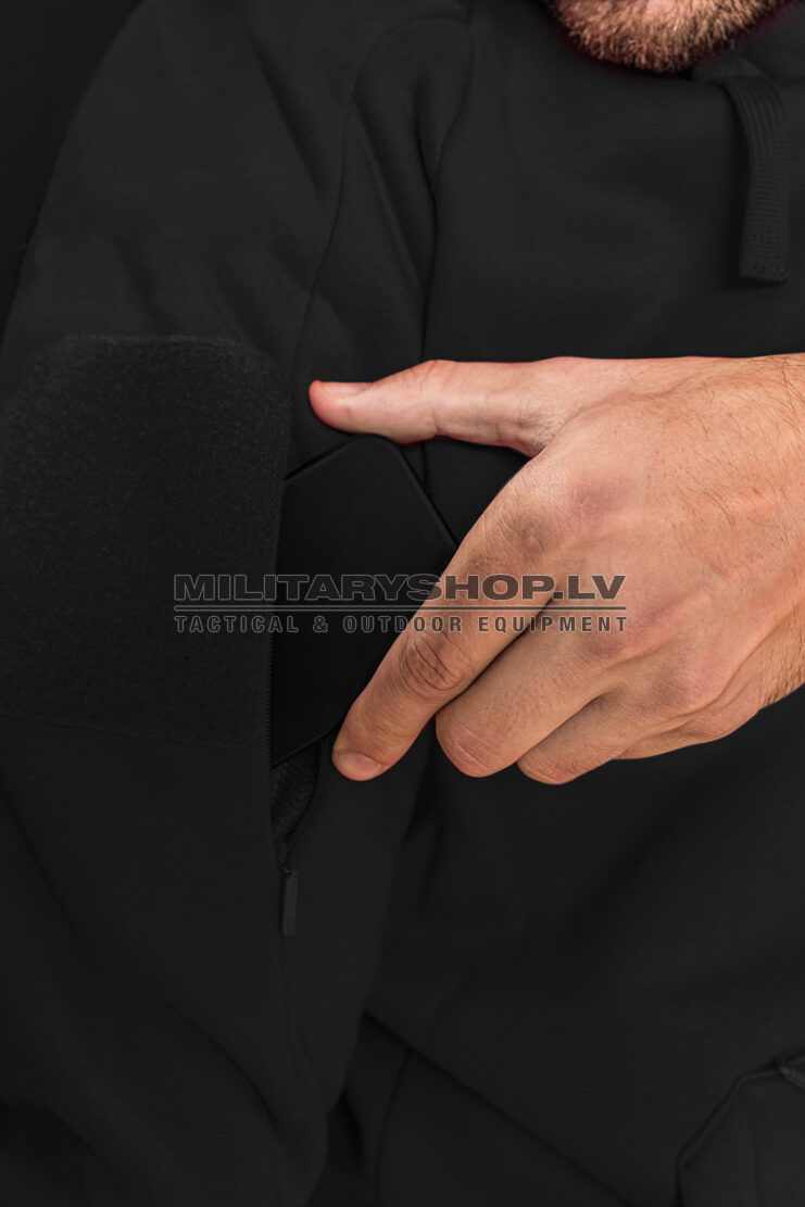 Due to the use of flexible fabric, the hoodie will not restrict movement, and smaller pockets placed inside the kangaroo pocket will allow you to organize your equipment and protect it from getting lost during the action. Above the main pocket there is a zippered pocket, which is perfect for carrying documents or a wallet. On both arms there are discreet pockets for small items and velcro panels to which you can attach patches.