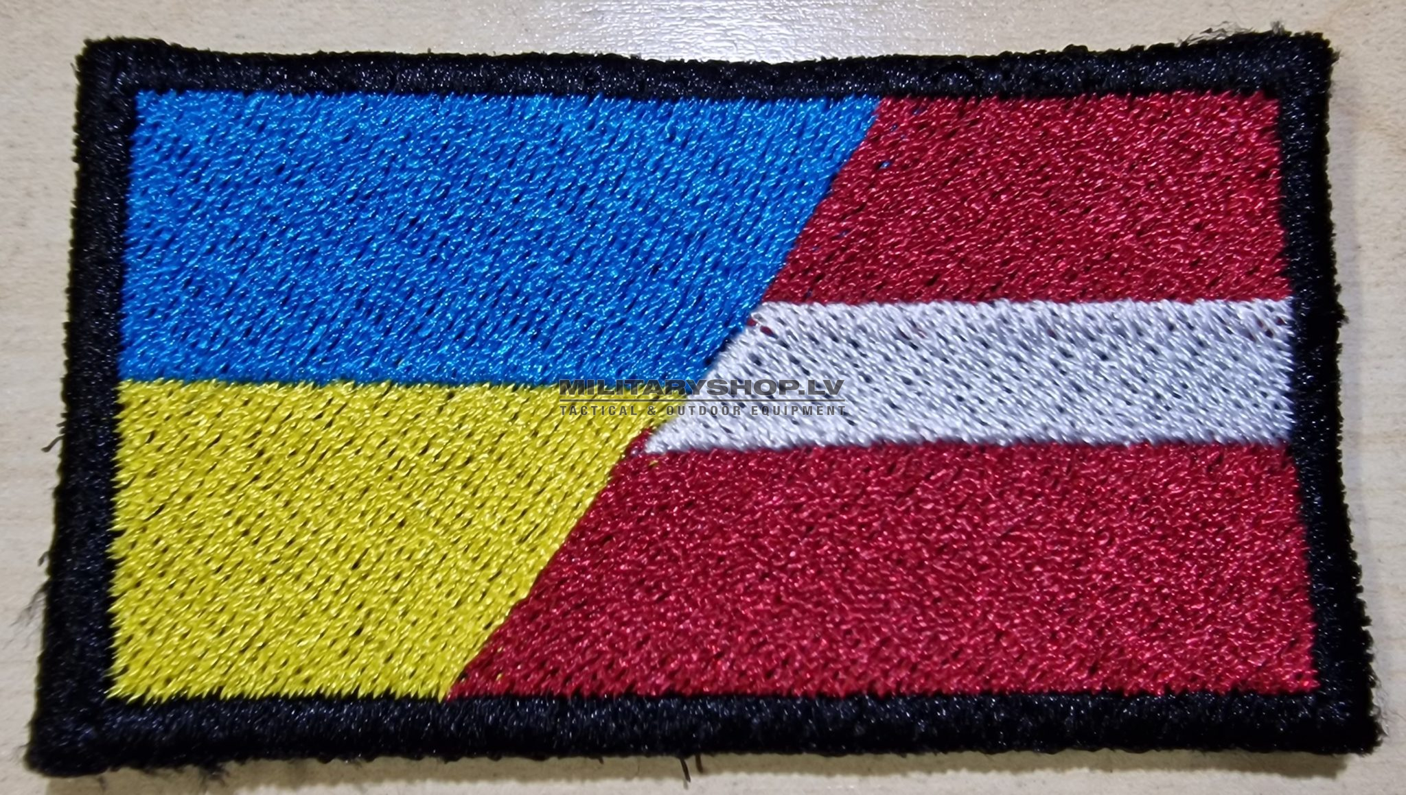 Embroidered patch with Ukraine/Latvia flags. Velcro on the back.