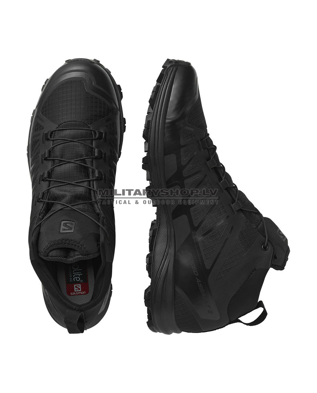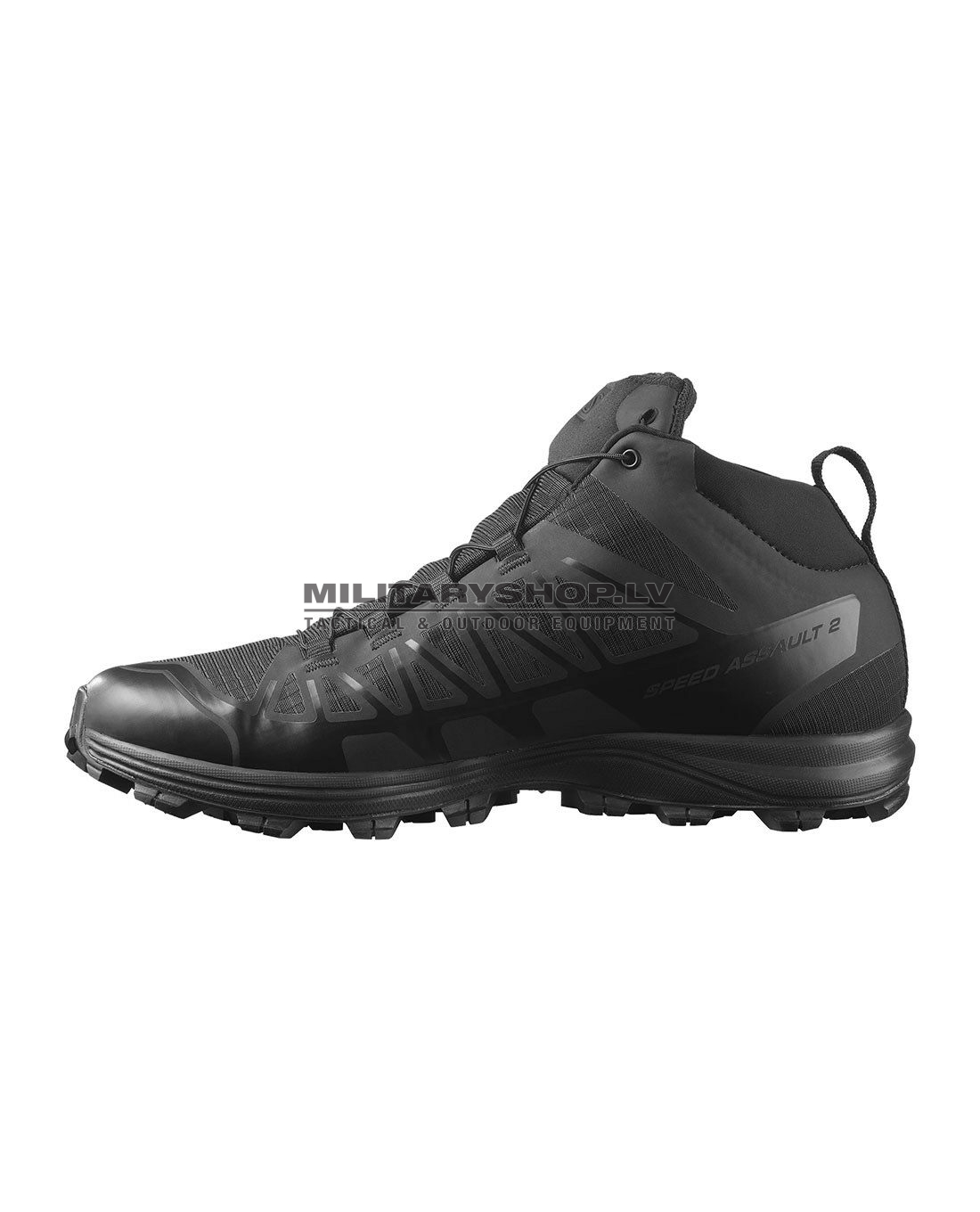For the intended use of the operational shoe in situations with fast reaction times and abrupt movements, the Speed 2 Assault was designed with a protective mid-cut with ankle support. The seamless Lycra upper with a high stretch content provides an almost custom fit and a comfortable feel while supporting the ankle; especially in loose terrain, this can counteract abrasions and bruises on the ankles or an unstable stance.