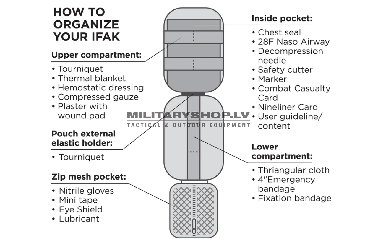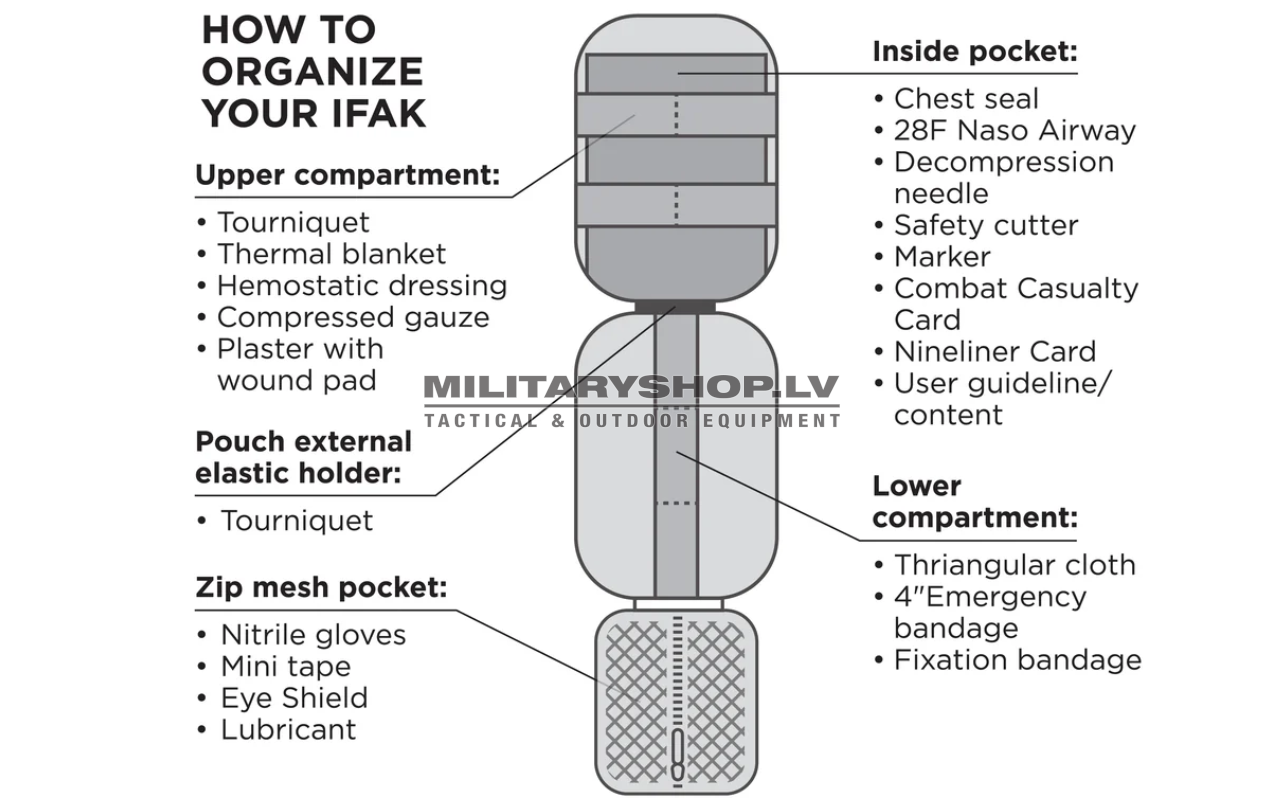 It’s designed and organized for use by trained and certified personnel to meet Tactical Combat Casualty Care (TCCC) guidelines for M.A.R.C.H. Tactical Medical Care (Massive Hemorrhage, Airway, Respirations, Circulation, Head).