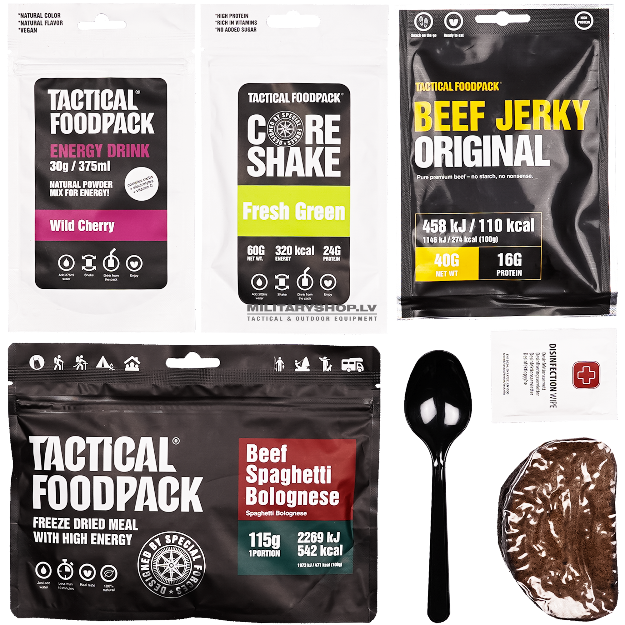Tactical Foodpack rations Delta, Echo and Foxtrot are designed for short-term challenges. The rations include one Tactical Foodpack meal, various snacks and an energy drink. Extras include a spoon, Tactical drinking cup and a disinfectant hand cleaning wipe. The ration bag is resealable. Tactical Foodpack is the best freeze-dried food for camping, hiking and outdoor adventures.