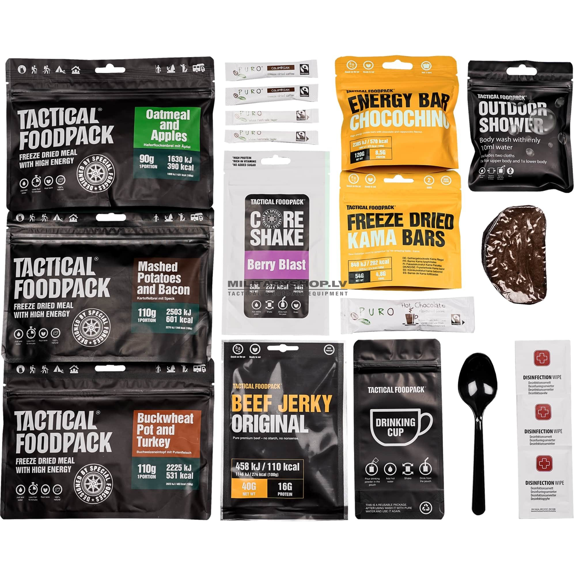 Tactical Foodpack rations Golf, Hotel and India are designed to help you plan your time and meals. The high-nutrition packs include three Tactical Foodpack meals and various snacks . You can make coffee or cocoa for a refreshing drink. Extras include a spoon, a tactical drinking cup and a tactical shower and disinfectant hand wipes are provided for personal hygiene. The ration bag is resealable. Tactical Foodpack is the best freeze-dried food for camping, hiking and outdoor adventures.