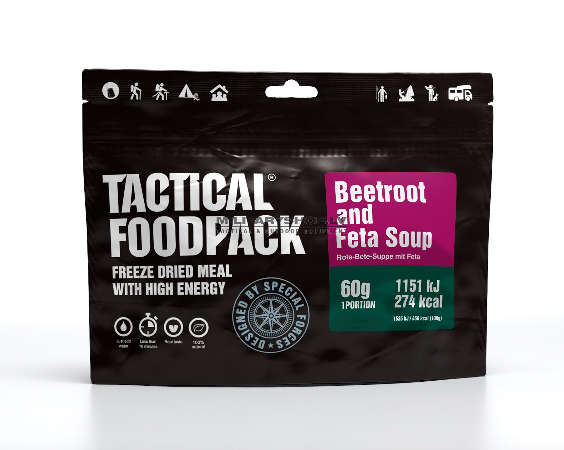 This colourful and healthy beetroot soup contains feta cheese. This delicious and creamy soup is a real plea sure for the lovers of both vegetarian and meat dishes. 100% natural, without preservatives and additives. Tactical Foodpack is the best freeze-dried food for camping, hiking and outdoor adventures.
