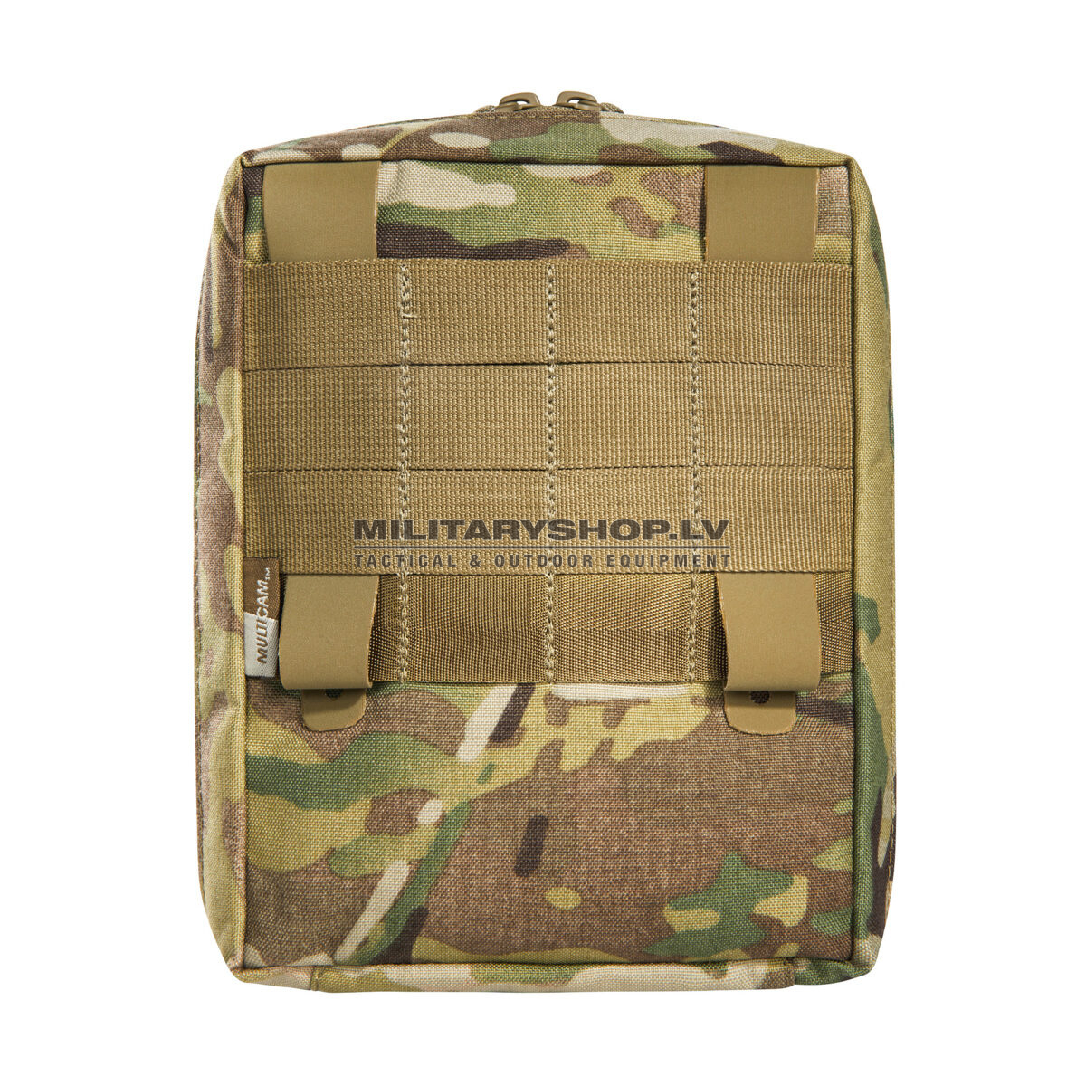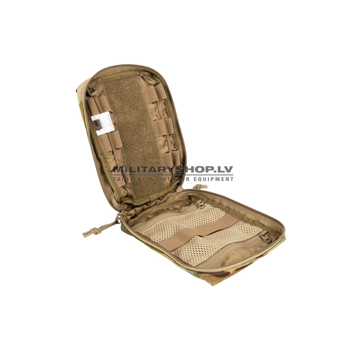 Accessory pouch with 20 x 15 x 6 cm dimensions, a large opening and the MOLLE reverse system. The inside features MOLLE hook-and-loop, a mesh pocket and elastic loops.