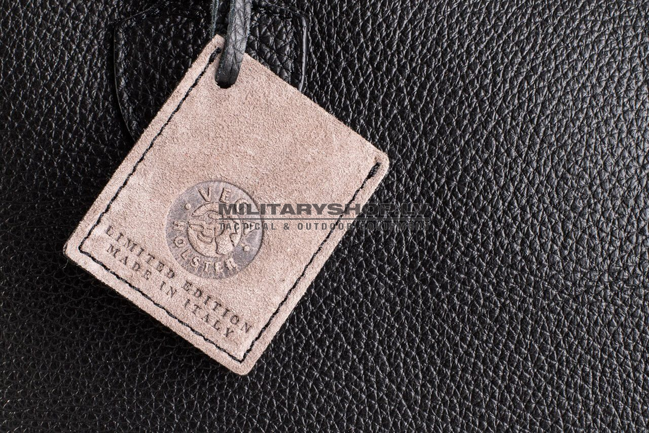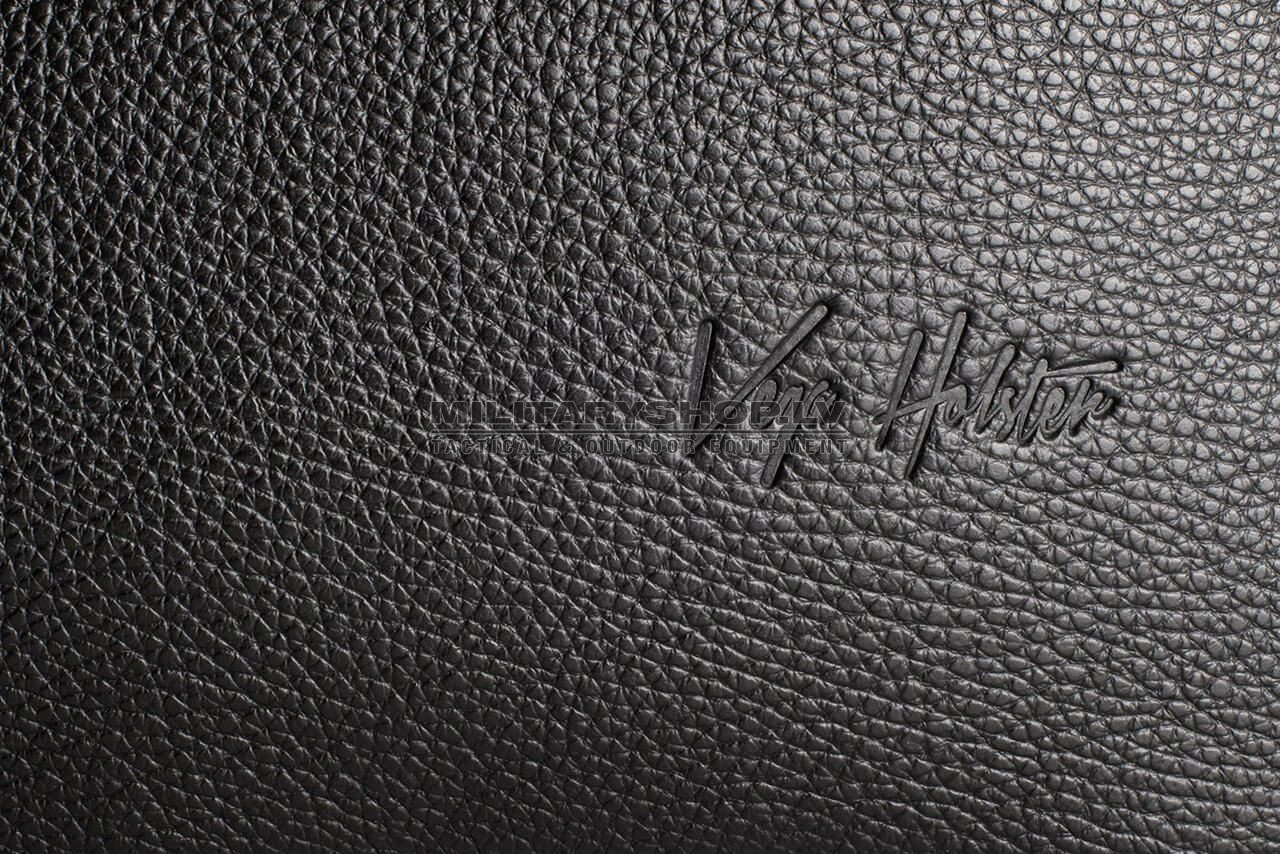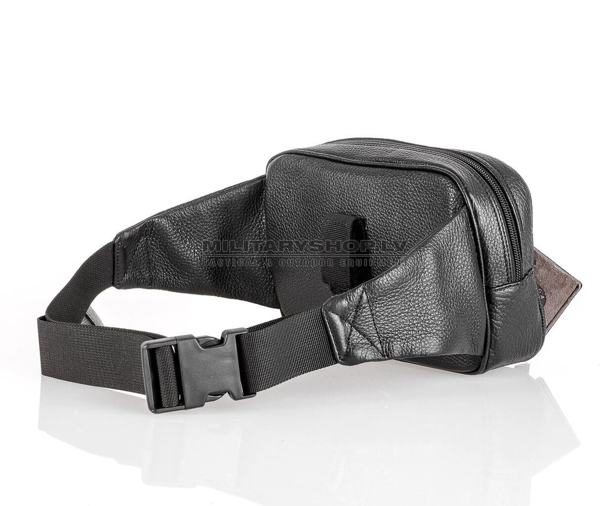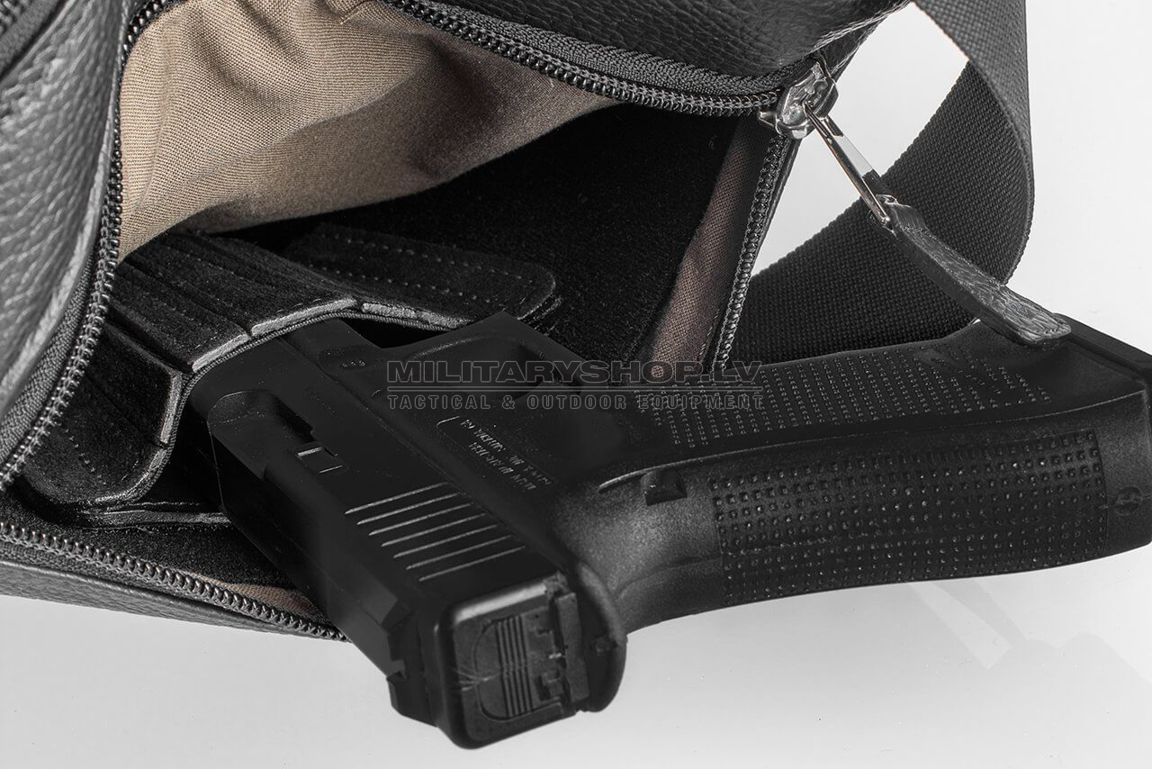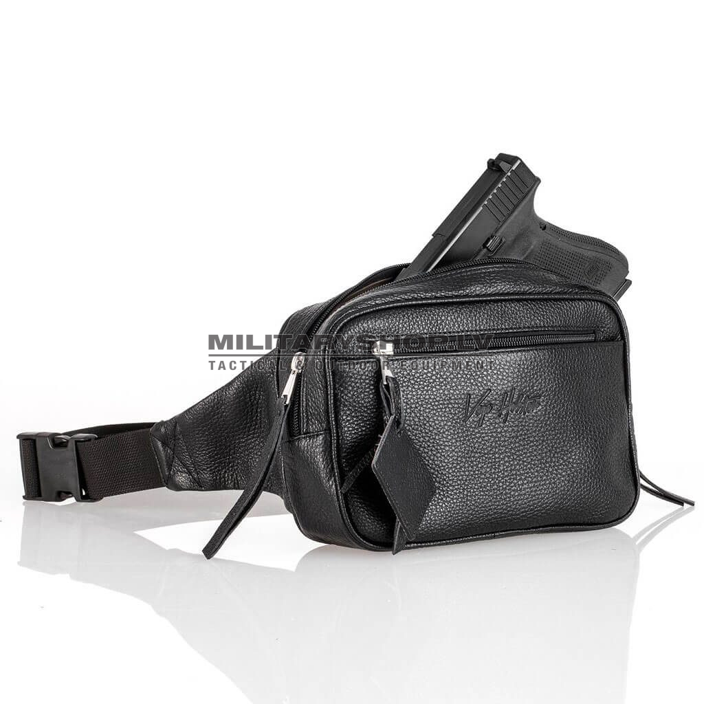 Classic and comfortable black leather waist pack suitable for concealed handgun carry. The waist pack features multiple pockets – a smaller utility pocket in the front with a magnetized outer compartment and a separate, sizeable compartment for concealed handgun carry. The inside of the handgun compartment is divided into two sections – one of which lined with a modular velcro wall for convenient and infinitely adjustable secure handgun placement within the pack, while the other section has an additional elastic pocket for extra utilities. The back of the waist back has a velcro strap for additional securing with a separate belt or other user-defined function. The waist pack comes with a highly durable and adjustable nylon strap.