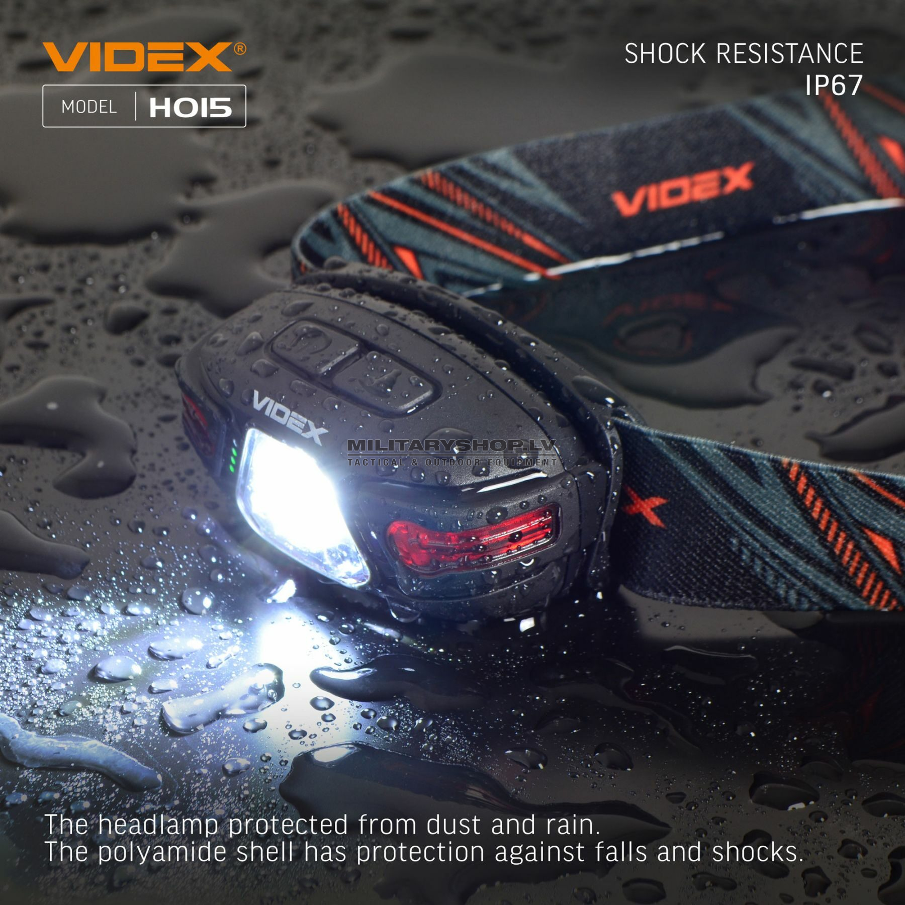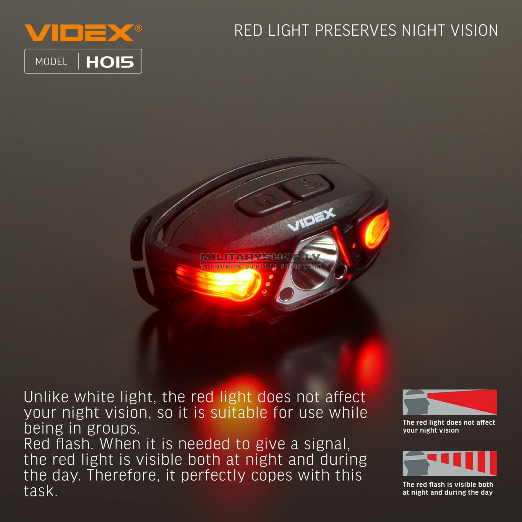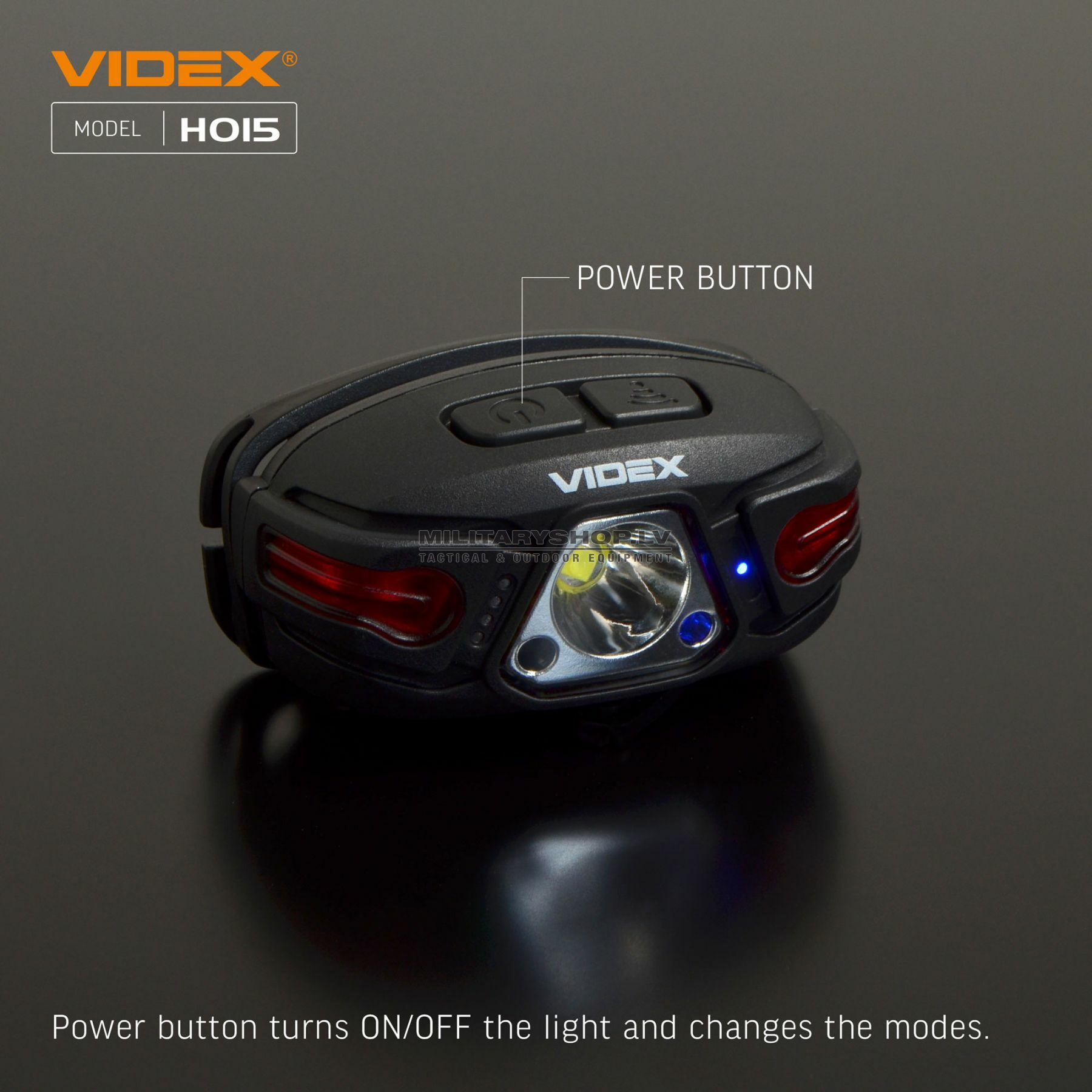 - Operation mode: HIGH, LOW, STROBE, RED ON, RED FLASH