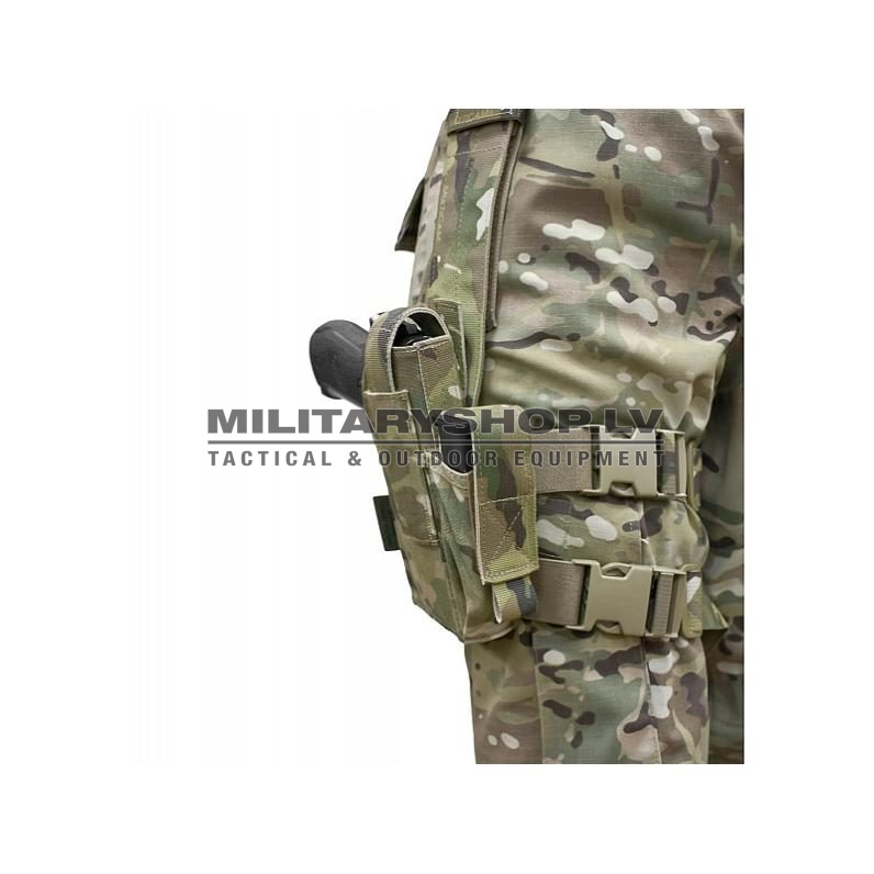 The drop leg holster, fully adjustable holster that will take most 9mm pistols. The Holster attaches to the operators belt via a height adjustable loop. The holster is secured to the thigh via two fully adjustable straps with quick release clips. The holster is compatible with warriors range of riggers belts, duty belts and the gunfighter belt. Made from Genuine US Materials, 500 D Fabric and Murdock Webbing.