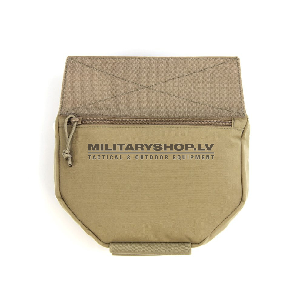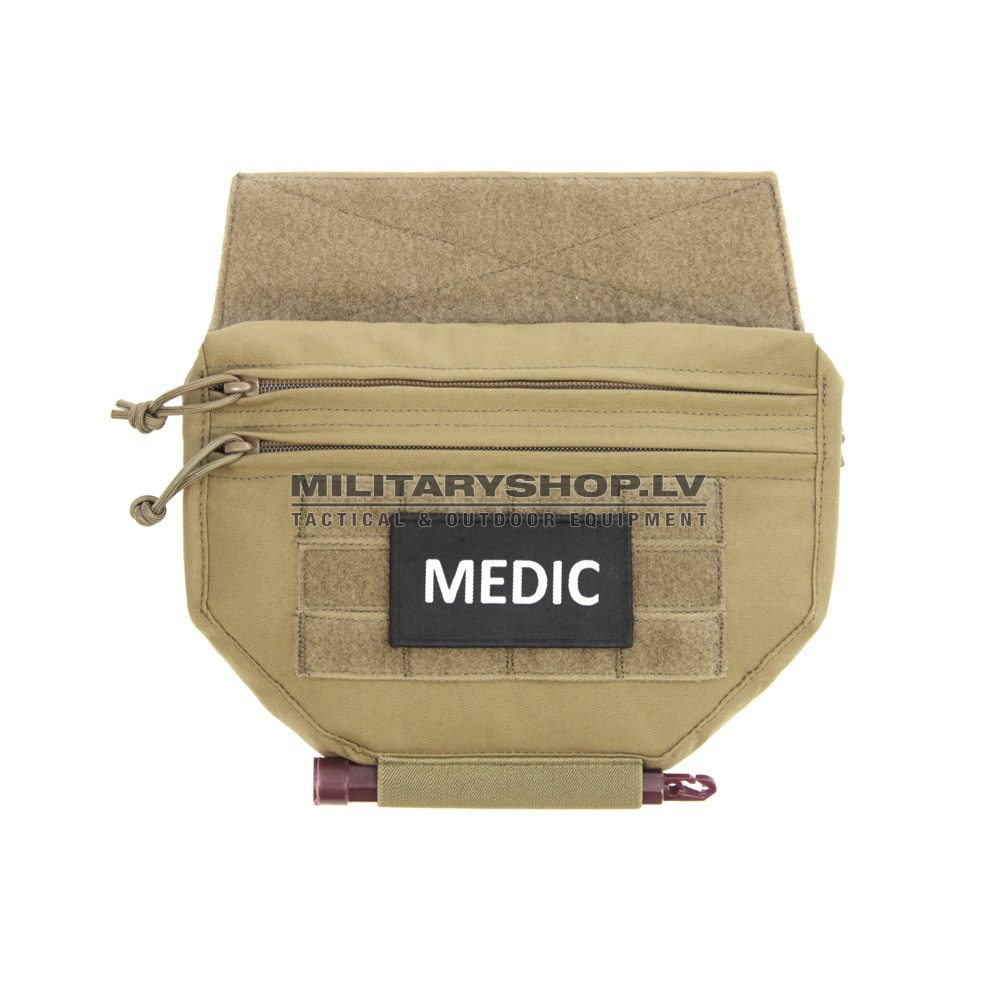 There are 2 zip pockets, the larger and main compartment is designed for storage and quick access of larger accessories and tools, Med Kit and Admin / Maps etc. The smaller pocket is good for storage of smaller items such as torches, batteries, Compass, etc. On the underside, there are 2 elastic loops for chemlights and or markers. The Drop Down Pouch can also be used as an armor add on for lower abdomen protection, we have included a rear pocket which allows a level 3a soft armor inserts to be added. The front of the pouch has 2 rows, each comprising 4 loops of MOLLE webbing with Velcro loop sewn on, ( and an additional row of loop Velcro in between ). This allows the attachment of other small pouches and or call sign and insignia patches.