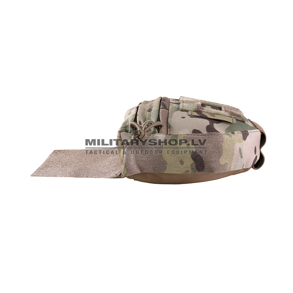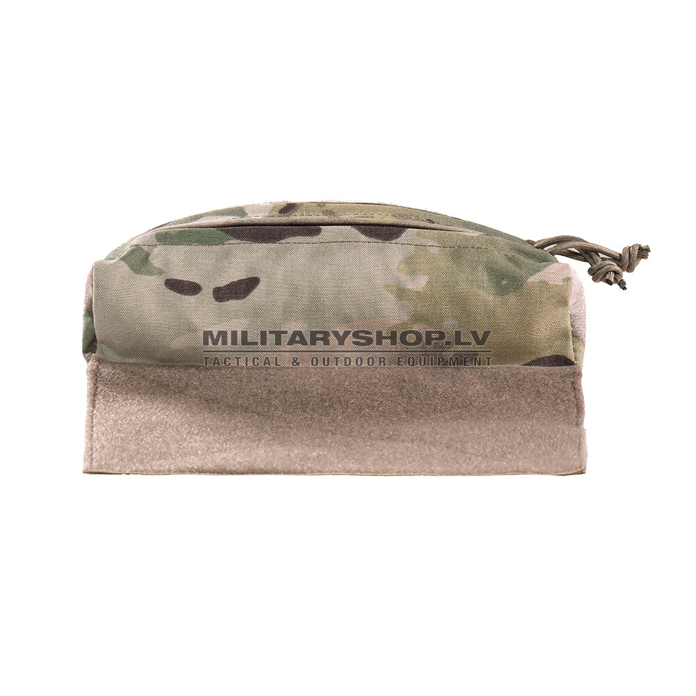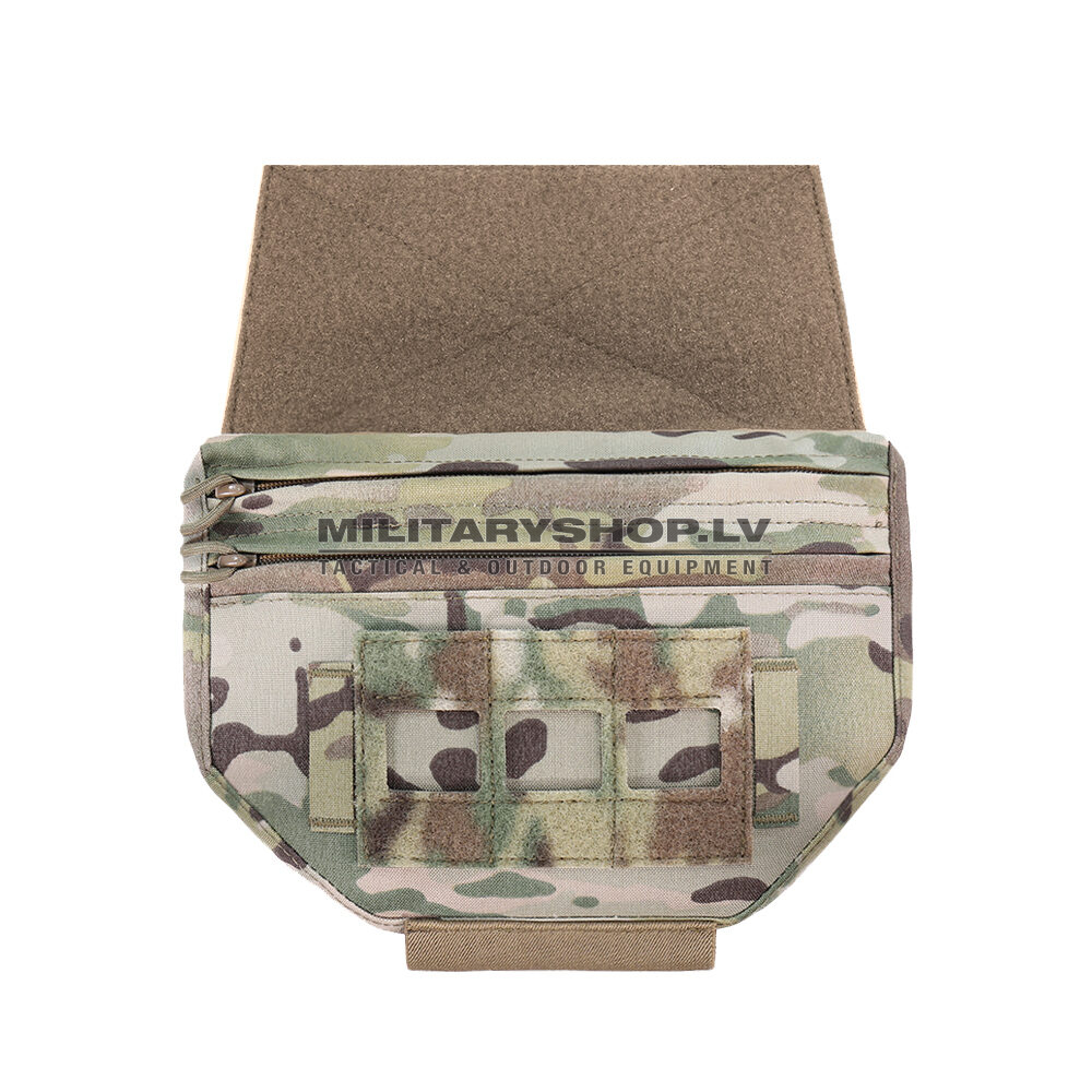 There are 2 zip pockets, the larger and main compartment is designed for storage and quick access of larger accessories and tools, Med Kit and Admin / Maps, etc. The smaller pocket is good for the storage of smaller items such as torches, batteries, Compass, etc. On the underside, there are 2 elastic loops for chemlights and or markers. The Drop Down Pouch can also be used as an add on for lower abdomen protection, we have included a rear pocket which allows a level 3a soft insert to be added. The front of the pouch has laser cut Velcro comprising of 4 loops that allow the attachment of patches or CATs.