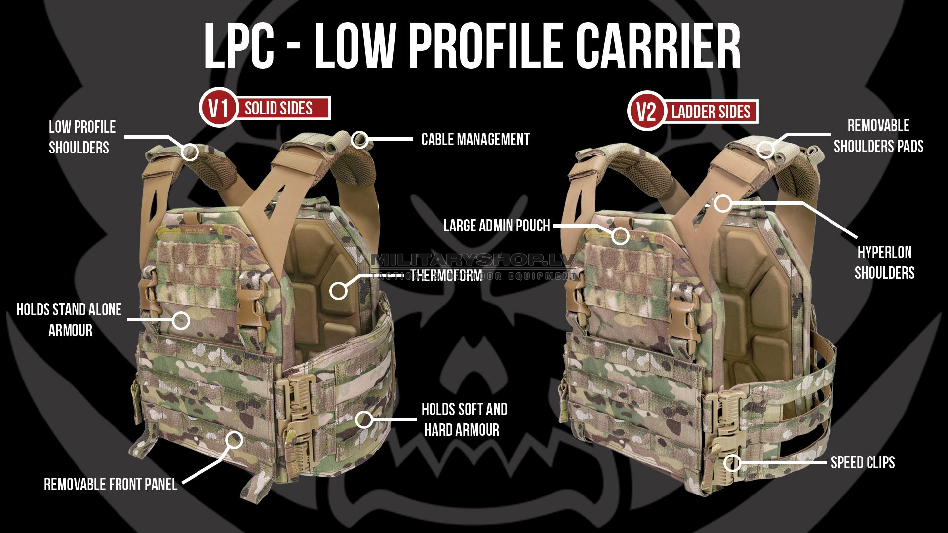 The LPC utilizes state of the art materials to reduce the overall signature and weight. It comes as standard with a removable MOLLE front flap held in place by 2 vertical QASM clips and hook and loop which allows the panel to be removed and replaced with a wide variety of preconfigured panels that are both weapon and mission specific.