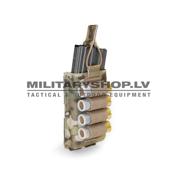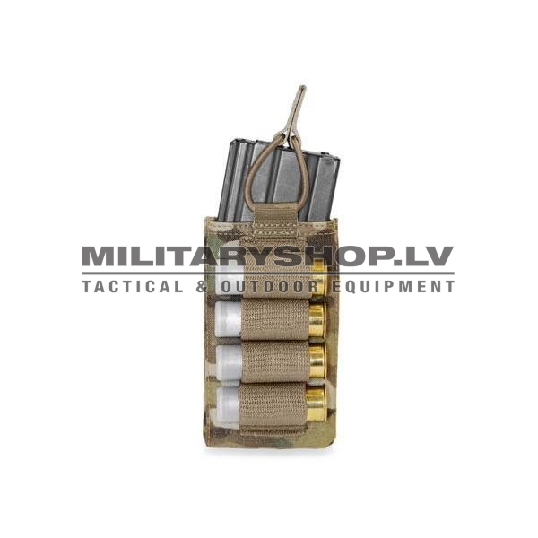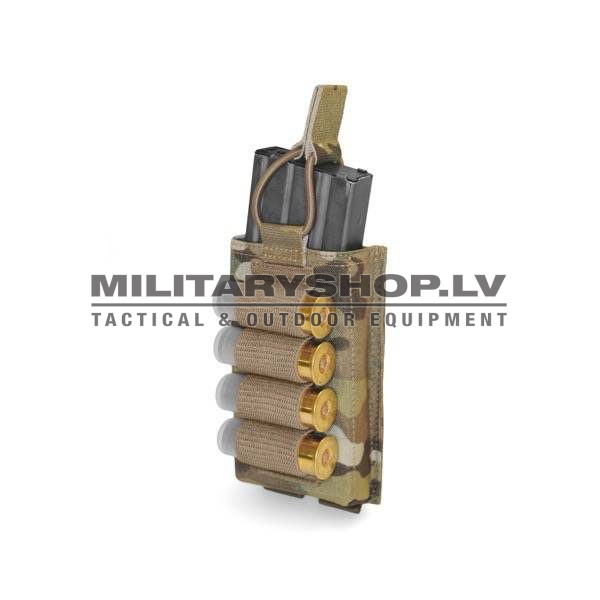The Single Open 5.56mm with shotgun strip has an elastic retention for fast smooth mag changes it is low profile and includes space for 4 rounds of 12 gauge Hatton breaching shotgun shells / CS Marker rounds etc. The main compartment is lined with black non-slip Posigrip material for extra mag retention. Designed to hold both metal and plastic 30 round 5.56mm x 45mm mags.