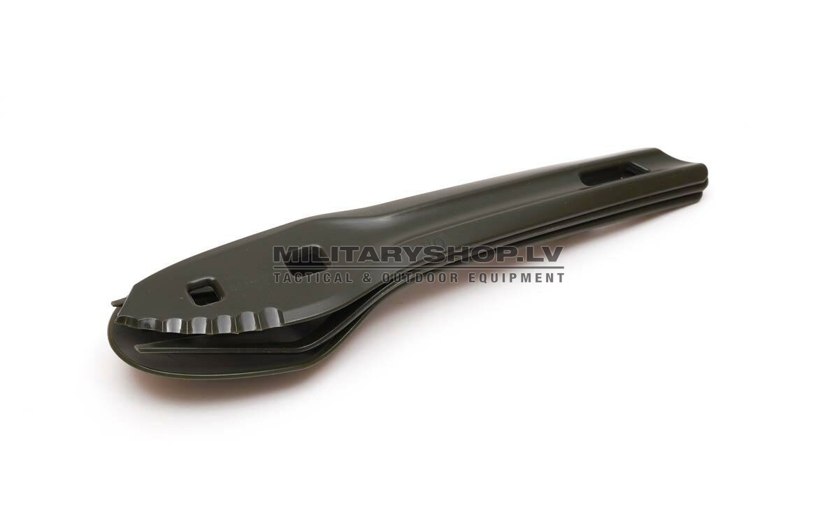 The spoon can be extended to a length of 25 cm. Hitch the knife over the first hook, then press them together until you hear a snap.